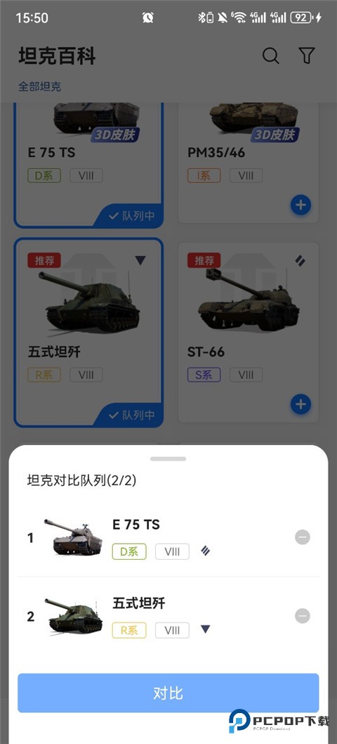 3、点击VS对比,即可查看你添加的坦克。