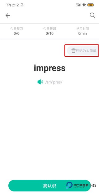 5、在单词自评页面点击右上角的【太简单】,则这个单词将被定义为简单词,不会在今后的学习中再次出现。