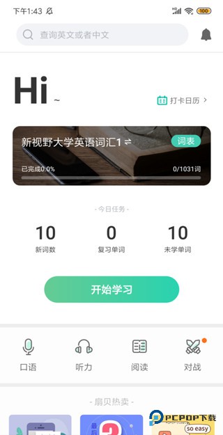 3、回到首页,就可以看到你选择的单词书以及设置的学习任务量,点击【开始学习】按钮既可开始背单词了。