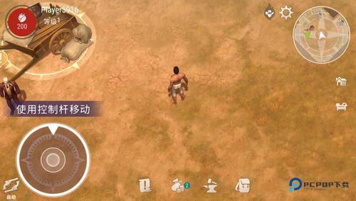 1、进入游戏,一下子进入一个有着广袤黄土地的世界。手指按住左边的操纵杆,通过拖动控制人物移动~