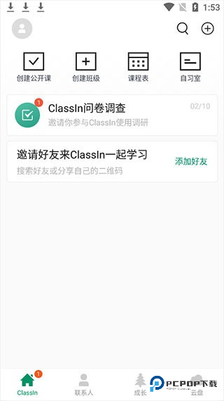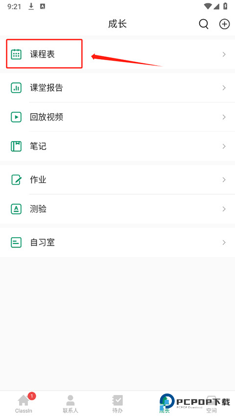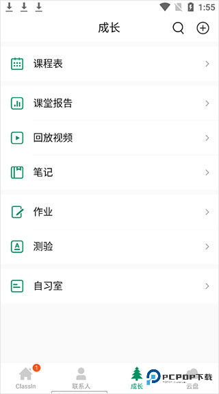 成长-课程表、课堂报告、回放视频、笔记、作业、测验、自习室