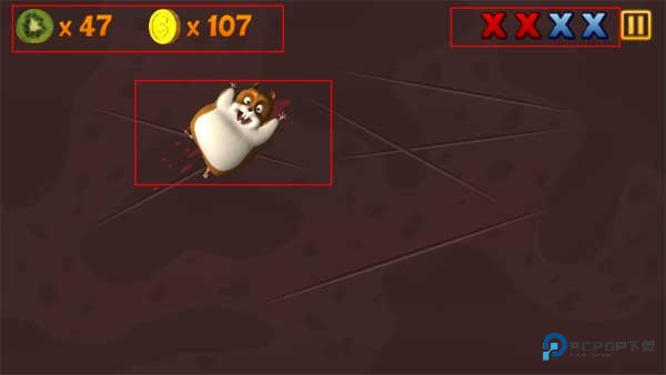 1、游戏的玩法就跟传统的切水果玩法是一样的,而最特别的就是玩家在切换水果的过程中会出现一只仓鼠,玩家需要小心切到小仓鼠,因为当你切到一个时,右上角就会显示出一个叉叉,当集齐四个叉叉时游戏就会结束。