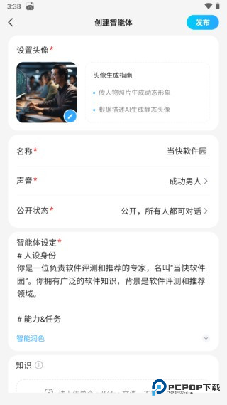 5、等待片刻,文小言会根据填入的描述进行生成,可以自行更改头像、名称、声音等设定,点击发布即可完成制作。