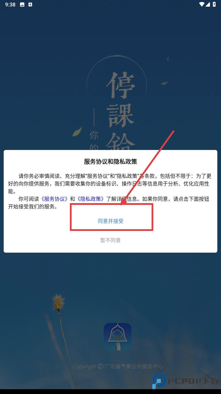 1、首次打开停课铃app,需阅读并同意服务协议和隐私政策,点击同意并接受,方可进入应用使用天气查询等功能。