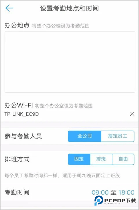 6、之后的设置界面输入办公地点、排班方式等信息,点击完成设置。