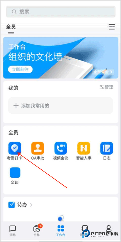 5、之后在工作台界面点击考勤打卡,来设置考勤打卡。