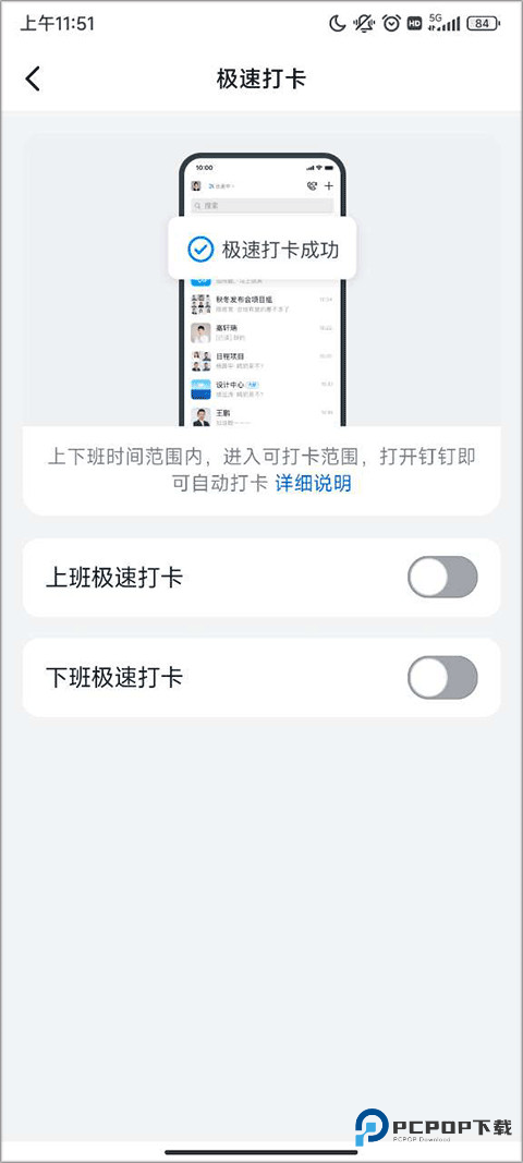 4、进入到极速打卡界面之后,把上班极速打卡和下班极速打卡后面的按钮打开即可。