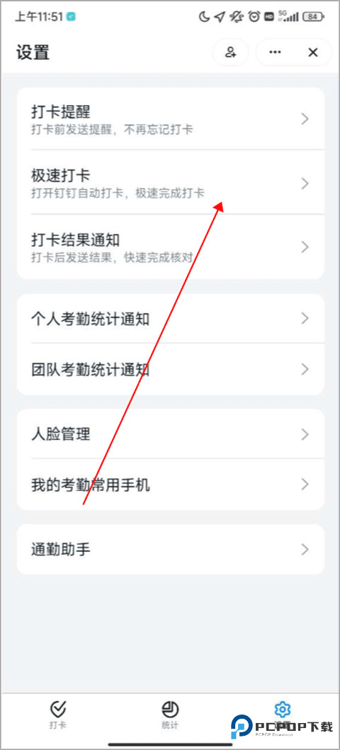 3、来到设置界面的选项之后,点击极速打卡选项。