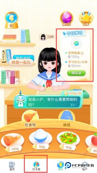 3、打卡型页面,能看到今日学习数据,点击赚能量可做任务,下方有吃食物、换装等互动,增加学习趣味性。