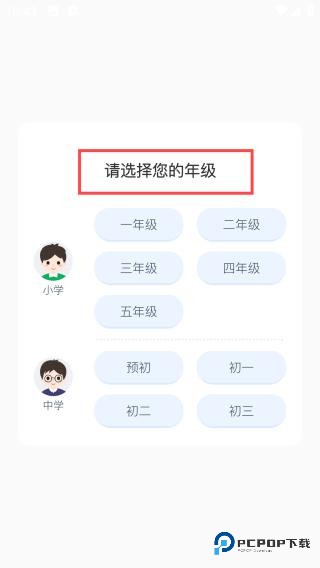 1、学习类 APP 的年级选择页,需从小学一至五年级、中学预初、初一至初三中选对应的年级,用于适配学习内容。