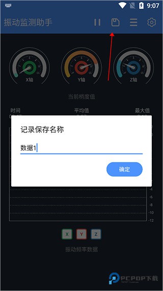 4、点击下图红色箭头所指的保存按钮就可以保存当前震动数据