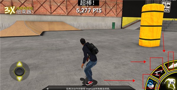 2、右边这个是抓板动作,按住不同方向和抓板可以组合成不同的抓板动作,也可以用于空中抓板,能够大幅度提升获得的分数