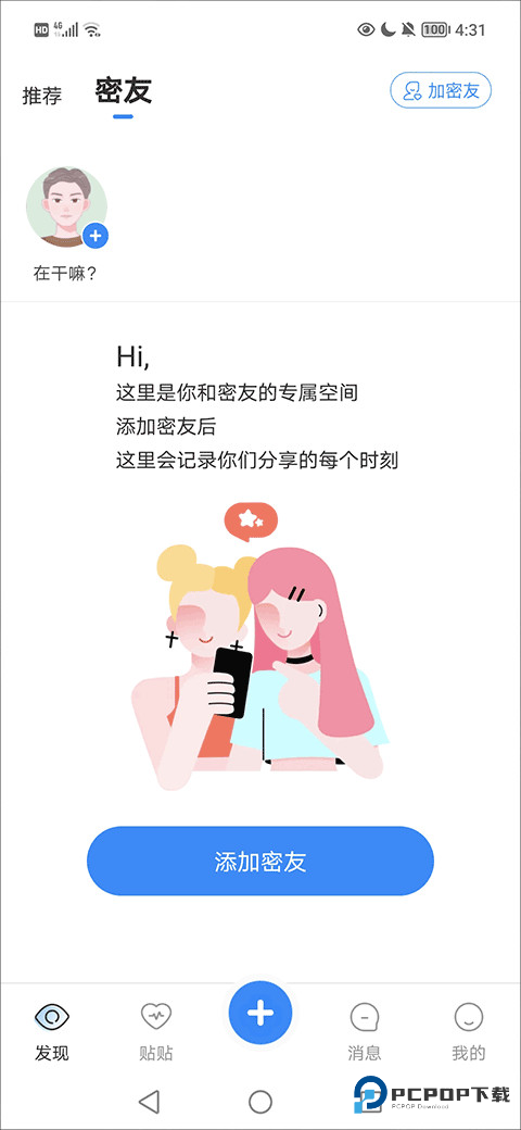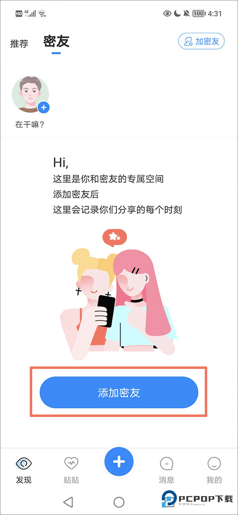 1、首先,打开软件,在软件的发现界面找到并点击“添加密友”选项;