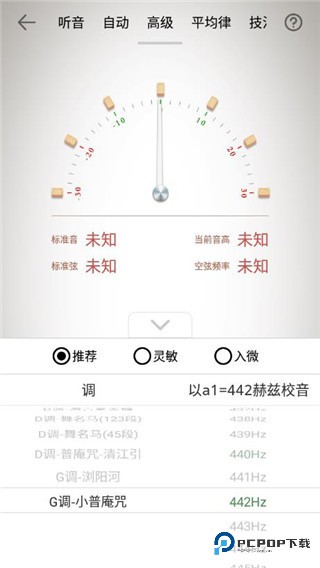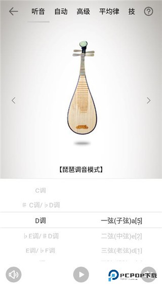 8、当屏幕下方的高级调音模式入口处于收起(未打开)状态时,为琵琶D调的调音模式。要调试其他调,需打开高级调音模式入口,在左侧一列选择要调试的调。