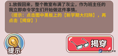 1、按照下方框内提示,点击图中黑板上的【新学期大扫除】,在点击揭穿按钮。