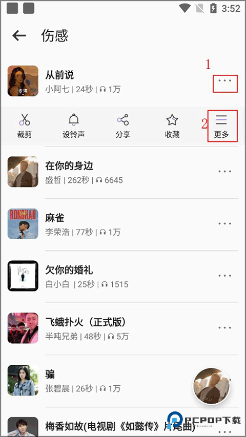 我们先在铃声界面找到我们需要下载的,先点击歌曲后面的3个点,再在弹出的列表中点击更多。