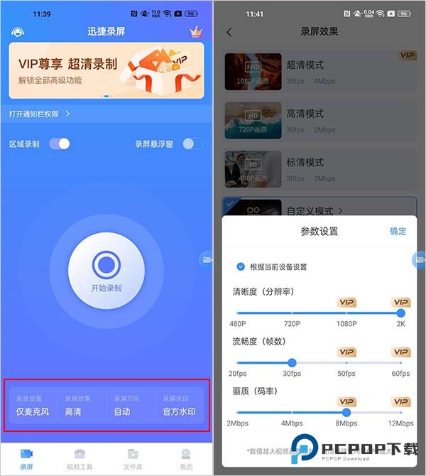 可对屏幕录制的相关参数进行调整,包括:视频方向、视频清晰度、视频帧数、视频码率等