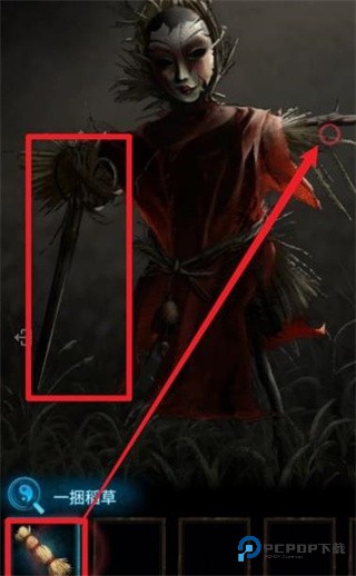 10、走出院子,点击地里的稻草人得到【飘带】,使用铡刀将【飘带】斩断(进行一段剧情后才能用),成【三段飘带】,使用【三段飘带】捆绑旁边的稻草,得到【一捆稻草】