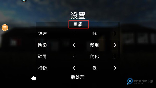 2、往下拉可以看到画质设置,在里面调节纹理、阴影、碎屑、植物就可以更改画质。
