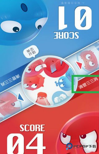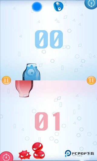 6、红蓝双瓶会不断随着中线飘移,而且瓶口会落下蓝怪或红怪,当恰好与最底下的小怪重合时,本方就加‘1’,一圈时限谁重叠越多谁即胜。