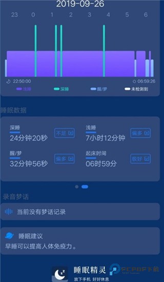 根据你的睡眠情况深度记录你的睡眠信息,详细全面的图表数据分析,图表明确详细,简洁易懂,包括深度睡眠,浅睡,醒,梦等,各个时间段的睡眠情况一目了然,每天更加清楚的了解自己的睡眠情况以达到更佳的生活状态。