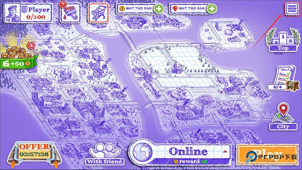 1、首先我们需要通过或者跳过游戏的新手引导,然后在游戏的主界面点击右上角的菜单图标。