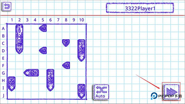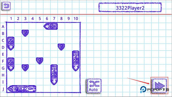 3、然后就进入到了一号玩家的布阵阶段,这里的话,点击Auto按钮可以一键随机布阵,布阵完成后点击右下角的【下一步】图标。