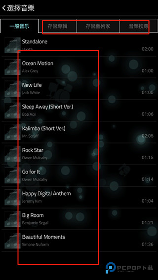 3、在这里可以看到各种音乐,也可以选择自己手机中的音乐来进行使用,无需手动导入,系统会自动识别获取