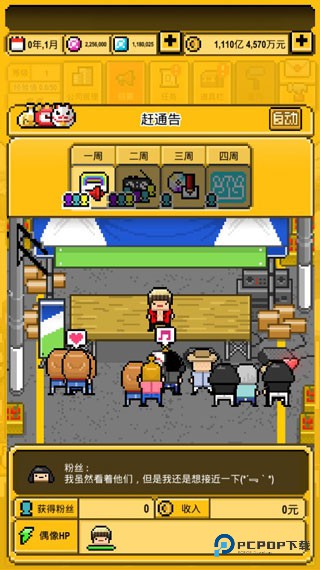 偶像天团养成记中文版是一款像素风格的模拟经营游戏,在游戏中玩家将扮演金牌经纪人,为手中的偶像团队安排各种演出和服装道具,帮助他们成功出道。游戏通过抽卡牌模式组建你的偶像团体,玩家需要通过制作专辑、编排通告和开演唱会来收获粉丝和增加自己的知名度,从而赚取更多的收益。