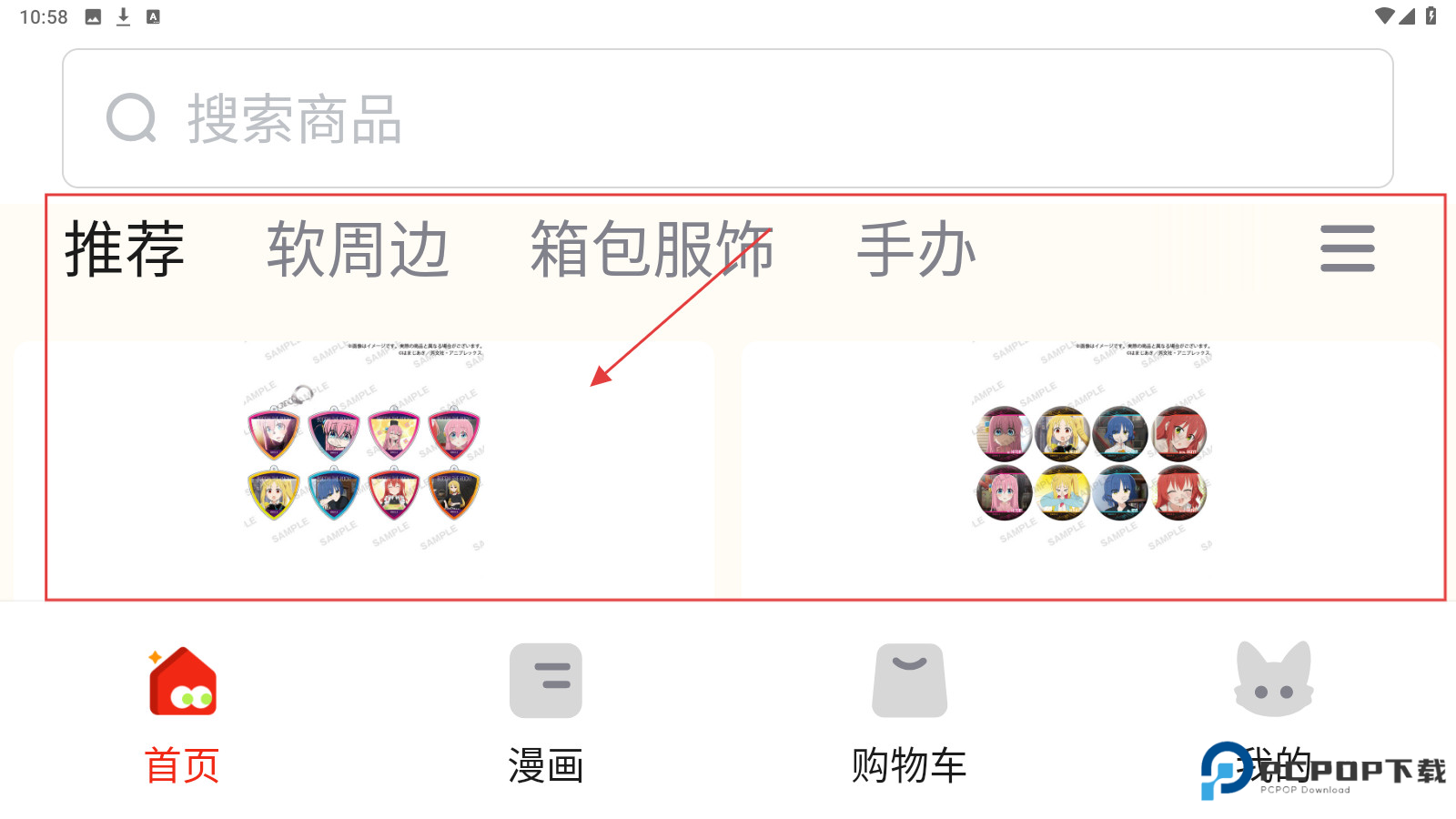 1、在首页选【推荐】类目,浏览动漫周边商品,找心仪好物。