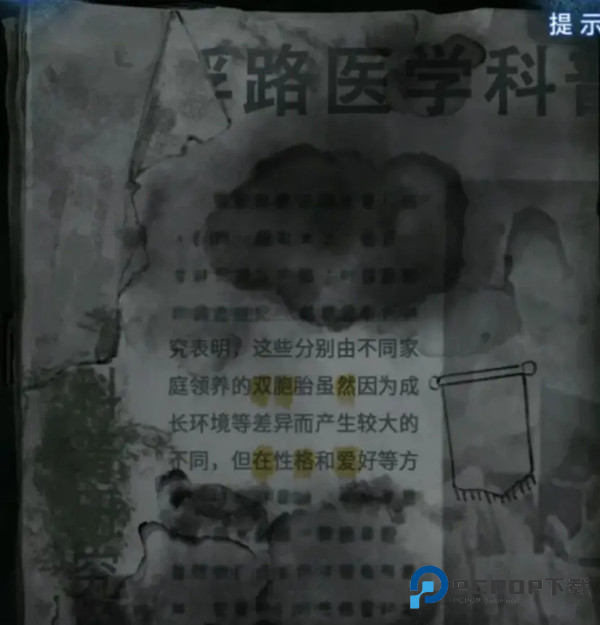 查看右边办公室的门,用【医用钳】开门,注意天花板小高能,开门进入办公室,查看左边的墙上挂上两面【锦旗】,但是还需要调整位置,查看右边墙上贴的纸条,重点是几个标了黄色的字,记下来【双胞然】【在格爱】。
