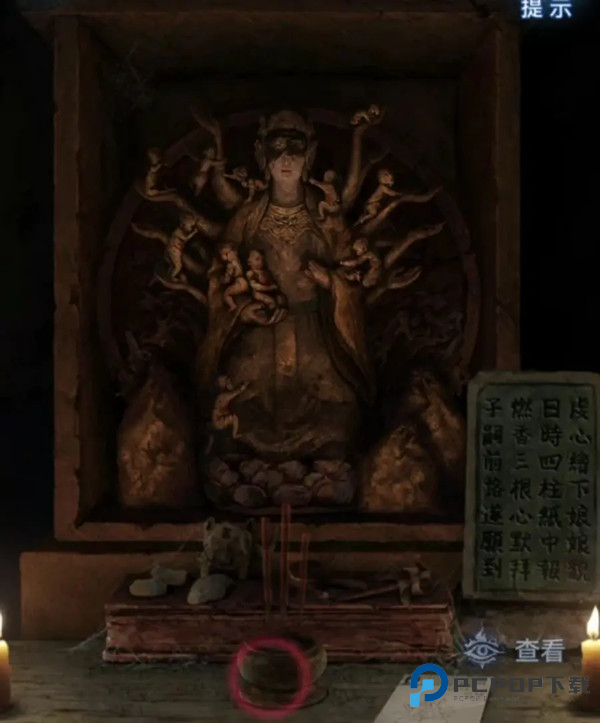 查看左边的楼梯间太黑了上不去,远处有个送子娘娘,查看一下右边的介绍,提示是需要【画下画像并且上三炷香】,我们大概是要找纸笔和香的,查看一下右边关着的门,门是5位数密码,调整为【58339】果然开门,进入。