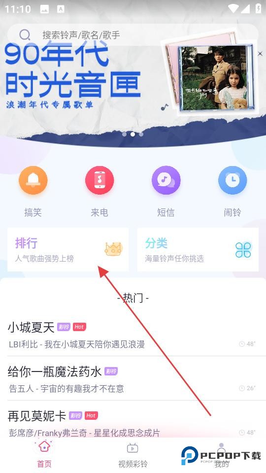 1、打开酷音铃声app,进入首页,点击排行板块,查看人气歌曲强势上榜内容,进入排行榜页面。
