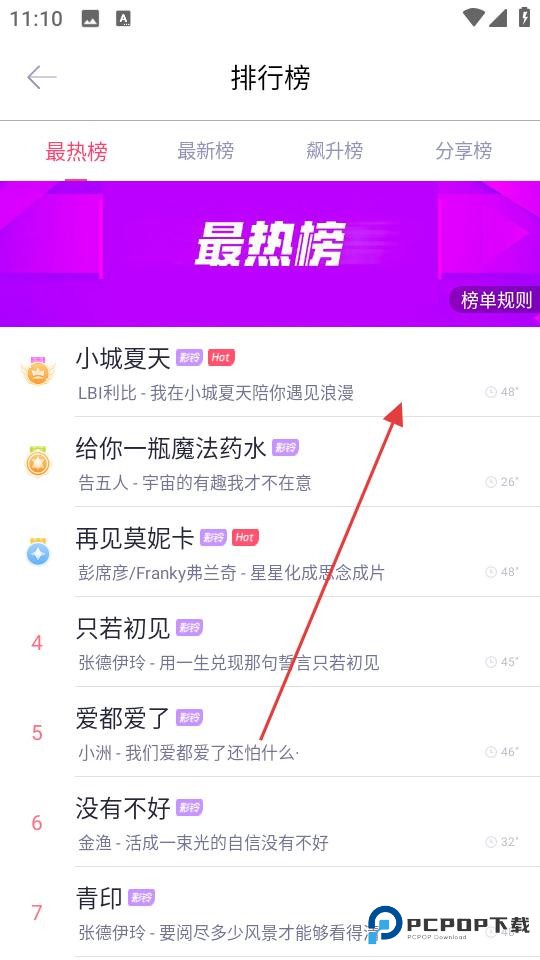 2、在排行榜页,选择最热榜,找到感兴趣的歌曲,点击进入操作界面,查看设彩铃、设铃声等功能。
