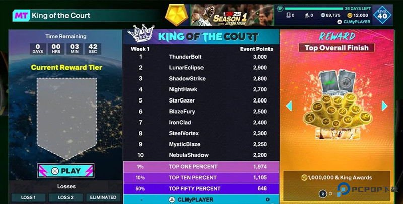 “球场之王”活动每周六举行(太平洋时间上午10点至下午2点)。玩家需通过前一周的“Showdown”或“三威胁公园”模式达到指定等级,或者直接提升声望等级来参与。比赛表现决定得分,失败三场将结束该周比赛。根据最终得分排名,玩家会被分组并获得对应奖励,排名越高,奖励越丰厚,其中包括稀有卡包、专属道具以及高达100万VC的顶级奖励。