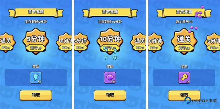 记得每次通关都领取下,有一把宝箱钥匙,分别为5分钟奖励、10分钟奖励和15分钟奖励。