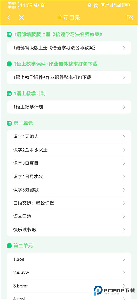 4、选择完成后就会进入该课本的单元目录中,你可以任意选择一个单元章节资料