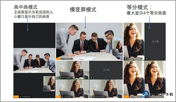 8、布局切换:手指左右滑动切换画面布局。指定画面:双击画面,显示指定窗口大画面,再次双击回到原布局(仅影响自己的设备)。横竖屏切换:根据手机横屏竖屏摆放自动切换(与系统竖屏锁定关联);