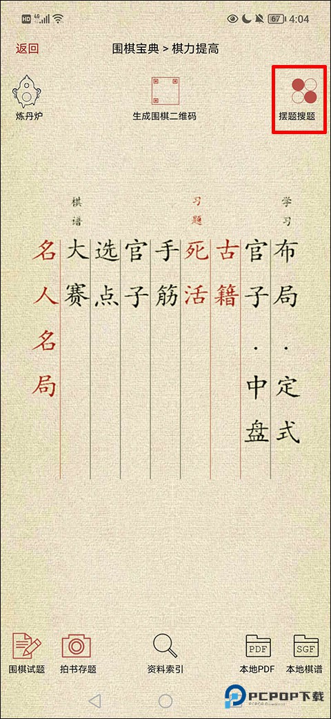 2、在棋力提高界面中找到并点击“摆题搜题”选项;