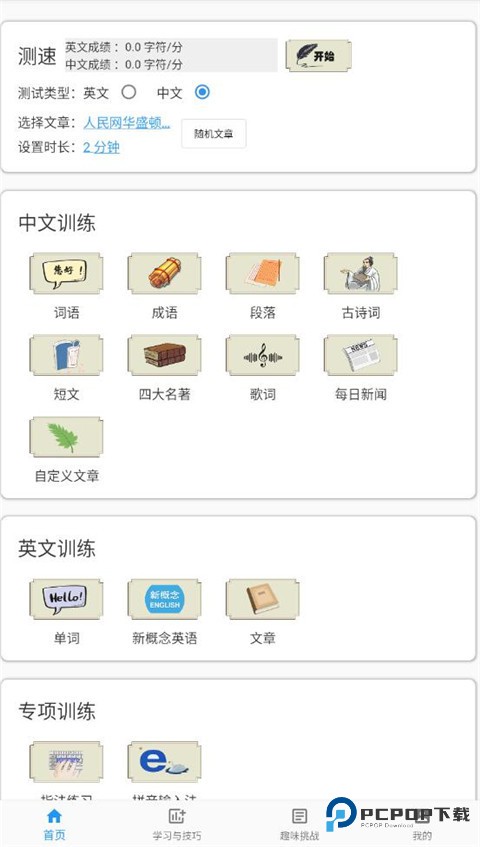 1、打开软件,可以看到软件可以进行中文训练、英文训练以及专项训练等,这里小编选择了中文训练