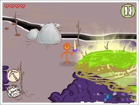 5、向右边的方向前进,可以避免靠近蓝紫色的岩浆。玩家可以到达下面的位置,然后用下方的树叶画笔在三个干枯的树枝上画树叶就可以通过岩浆了。