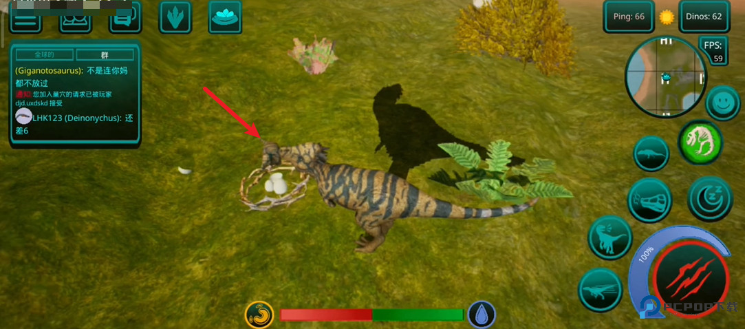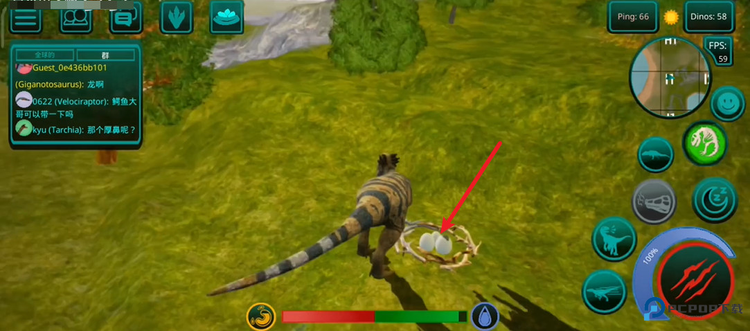 2、我们以肿头龙为例,首先找到有水源有食物的地方趴窝,小龙出来状态低,容易饿死渴死。