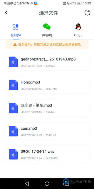 3、然后将手机中的音频文件或者微信、qq中的音频文件上传即可