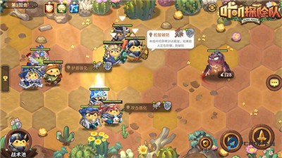 3、战斗系统:遇怪后触发回合制战斗,玩家选择先后手、使用卷轴,咔叽技能自动触发。探险小队最多 12 只咔叽,战斗时 9 只出战 3 只待命。