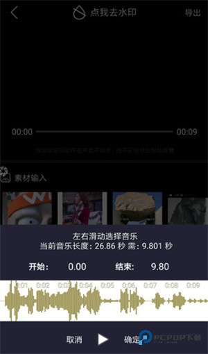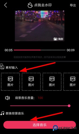 3、接下来需要滑动到下方使用“素材输入”功能,添加手机本地相册的图片素材,甚至是替换背景音乐。