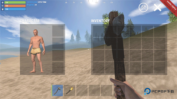 2、点击右上角背包可以打开背包,同时可以查看制造和可制造列表,以及你的穿装信息,我们可以用手指拖动将背包里的东西拖到屏幕正下方的腰带上,点击不同的物品来切换腰带上的激活物品,以便使用物品。