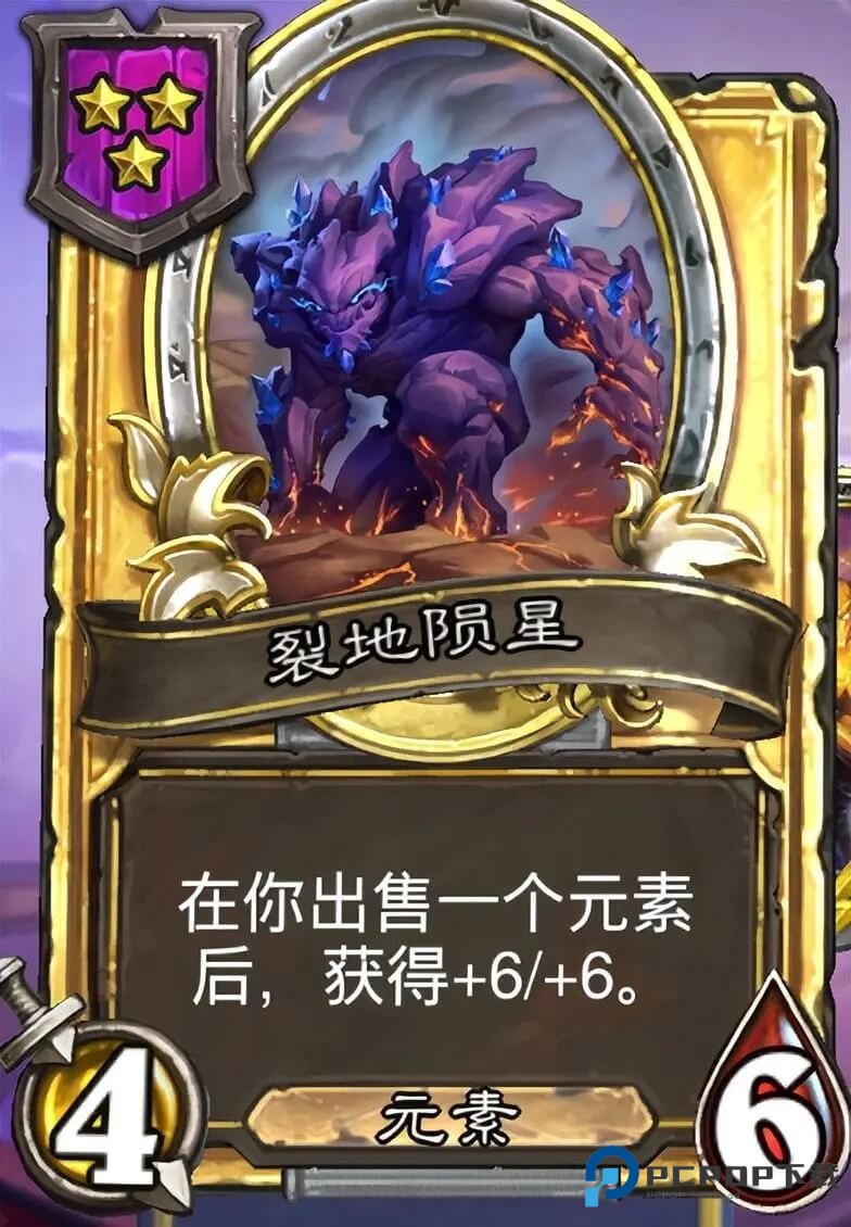 元素自身有很多需要买卖随从的机制,三本的裂地陨星补丁还进行了加强,每出售一个元素,自身都会获得+3/3,合金之后可以+6/6。目前是小二很推荐大家固定留一个格子给他,能从前期直接带到决赛,大概率会是场上身材最大的元素。
