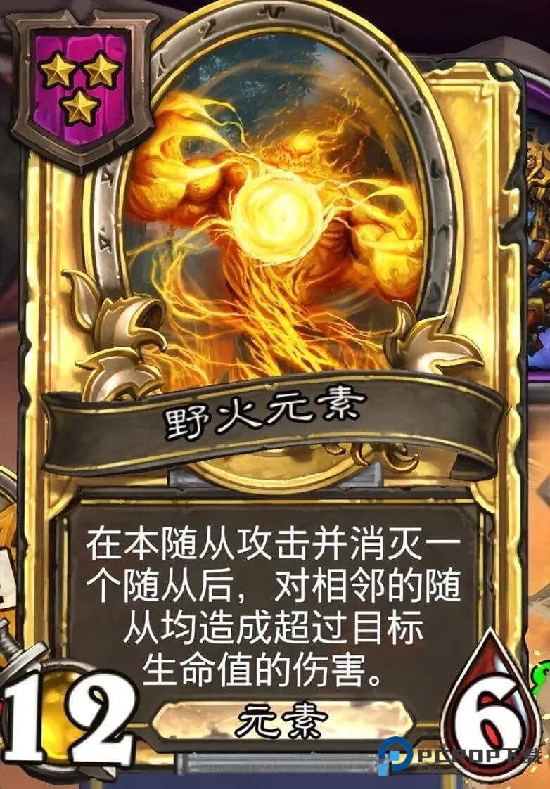 前面的组件基本都是经济和成长卡,核心战力卡没有争议,非三本的野火元素莫属。合金之后攻击消灭一个随从之后,会对相邻的随从造成超过目标生命值的伤害,相当于一个丐版的狂战,最好的情形是套上圣盾,打两拨基本就奠定胜局了。