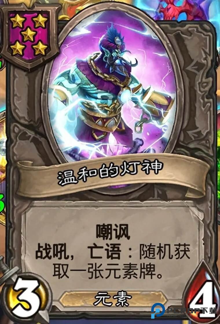 五本温和的灯神,自带嘲讽、战吼和亡语三重属性,再刷到的第一时间,即使没有铜须也能快速补充一张元素,加上亡语还会持续给元素牌,是不可多得的资源神级卡。合金之后是给两张,元素升腾流需要大量刷元素,温和灯神是最佳伴侣。