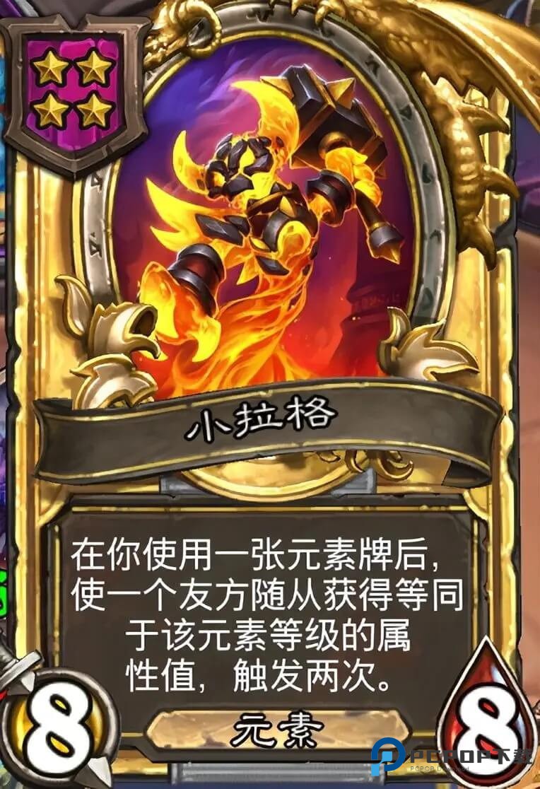 和使用元素相关的随从卡有二本的派对元素和小拉格,遇到都可以抓来打工。尤其是小拉格,合金之后的小拉格在使用一张元素牌之后可以让一个友方随从获得该元素等级×2的属性,成长上限是要比裂地陨星高的,不过因为会歪到过渡牌上,所以小二不是很喜欢带。